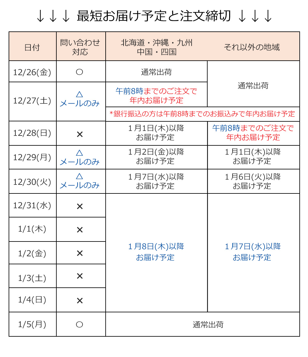 また、2026年1月4日~5日まで(ご配送地域によっては1月6日まで)の着日指定はお受けできませんのでご注意ください。