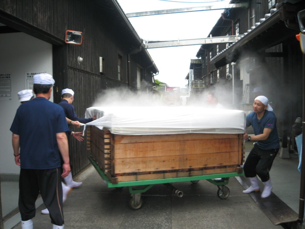 ▲木製甑で蒸米はパラパラ