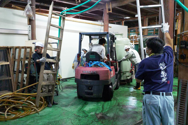 火災を免れた醸造設備を避難させる作業を行っています。これから復旧と仕込みを並行させて行っていかなければならず、その困難は計り知れません。
