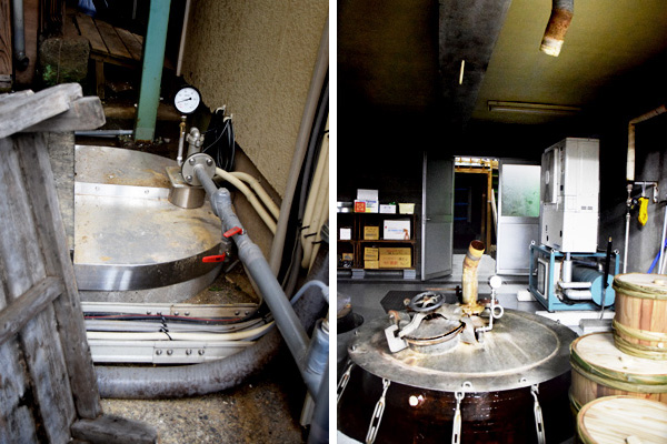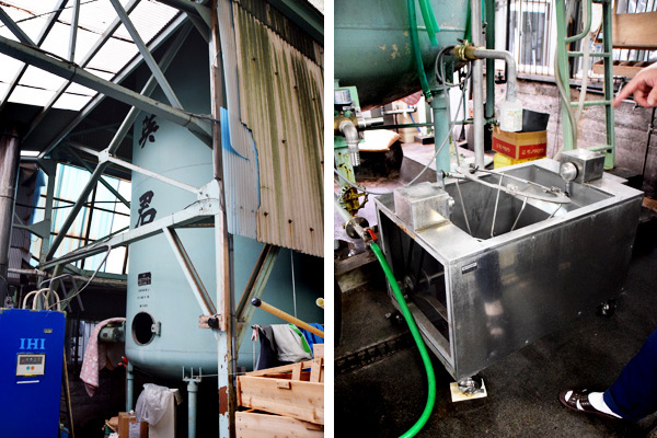 ▲写真左は洗米用の水をためるタンクです。洗米する際は5キロ毎に分け、ウッドソンの洗米機で洗米後、更に写真右の洗米機にて2度洗いをします。こちらが青島酒造(喜久酔)さんと工業技術センターで開発された洗米機で、ざるを枠にセットするとグルグル回り、1分毎に上から大量の水が広がる様に噴射してくるそうです。徹底的な洗米をする事で、糠を落とし米由来の雑味が残らないよう心掛けています。その後限定吸水をさせます。