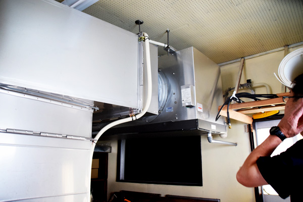 ▲見学当日、最高気温29 度と10 月とは思えないくらい暑かったです。ここ最近、気温が安定しないので、3 年前に写真の冷気を造りだす機械を導入しました。蒸米放冷機のダクトに繋げ、素早く温度が下がる様にしています。同時に0 度迄の冷水を作る事ができ、仕込み水を思った通りの温度にします。暑さ対策に余念がありません。