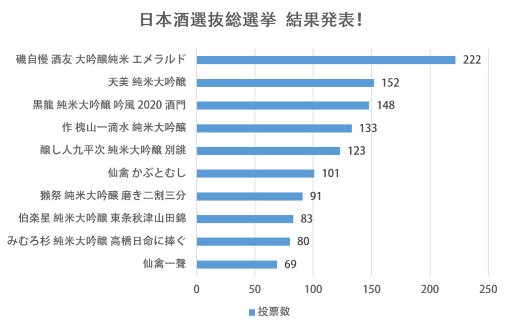 大変多くの方々にご投票いただいた「日本酒選抜総選挙」。皆さまご協力いただき誠にありがとうございました(*^-^*)注目の最終結果が…こちら!
