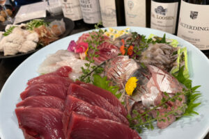 ―― そんな努力を経てこのワインができていると思うと、より美味しく感じますね…。この赤ワインには意外にも、鰹の刺身がよく合います。ワインの丸みのある果実感と油分の少ない夏鰹の赤身がストレートに混ざり合いました。また、醤油とも相性◎。これは藁焼きにしてもよく合いそうです。(白沢)