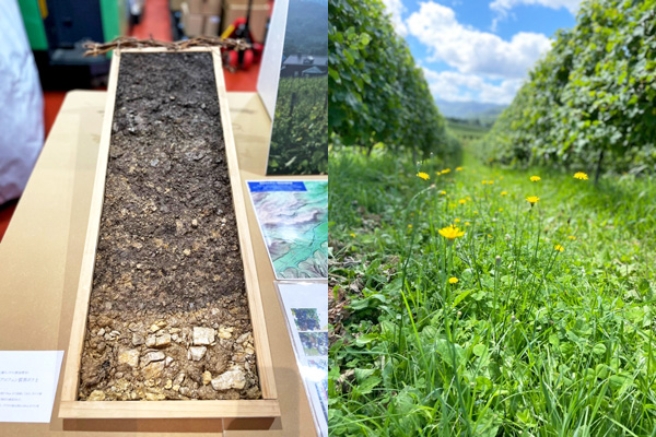 ▲(左)平川ワイナリーの土壌 (右)草生栽培の様子