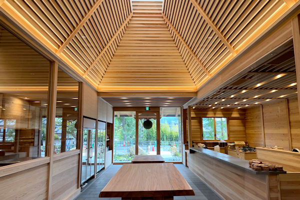 建屋にはすべて、三輪山の杉を吉野山に植えて育てた“吉野杉”を使用。奈良県の伝統的な建築技法であり、正倉院の造りでもある“板倉(いたくら)造り”と“校倉(あぜくら)造り”の美しい建物で、三輪の歴史と文化を体現しています。中には試飲カウンターや冷蔵庫があり、ガラス越しに仕込みの様子を見学することができます。カウンターも木桶も甑も、ありとあらゆるものが吉野杉でできており、蔵には爽やかで落ち着く杉の香りが満ちていました。