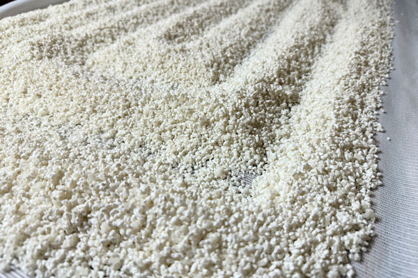 ▲菌糸がしっかりまわった麹。他の日本酒蔵の人が見学に来ると、この麴に一番驚かれるそうです。それくらい溶かす力が強い麹です。