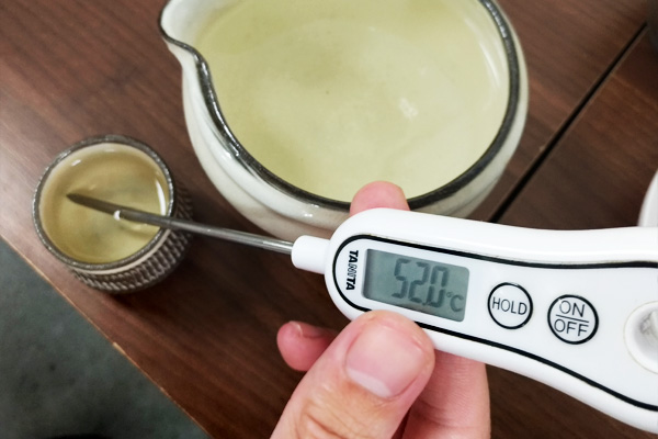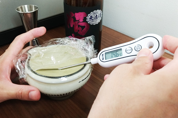 ▲次に熱燗と言われる50度あたりを目指し600wで90秒温めました。結果は熱燗と呼ぶには高い58.3度になってしまいました。実践したスタッフは悔しがっていました。