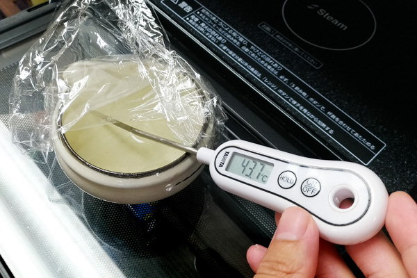 ▲まずは、ぬる燗と言われている40度あたりを目指して600wで60秒温めました。出来上がった温度は43.7度。惜しい!ちょっと上燗よりの温度になってしまいましたが、懸念していたムラは気にならず、味わいのバランスも崩れた様子はありませんでした。香りが冷よりほのかにたち、冷で感じた酸味がうまい具合に馴染んでいました。