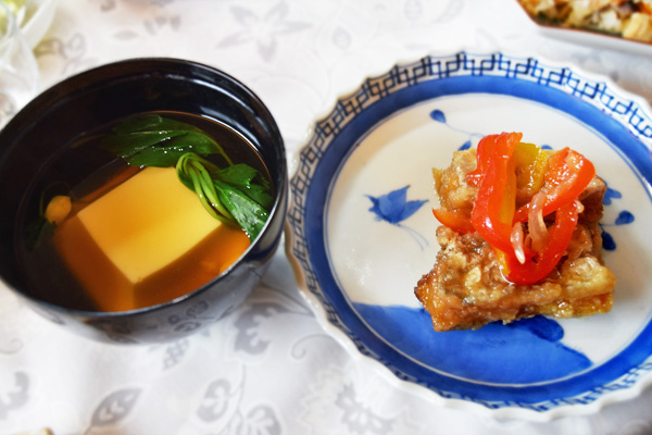 <写真左 卵豆腐と一番出汁のお椀 合わせたお酒:山田錦 大吟醸 雑賀>