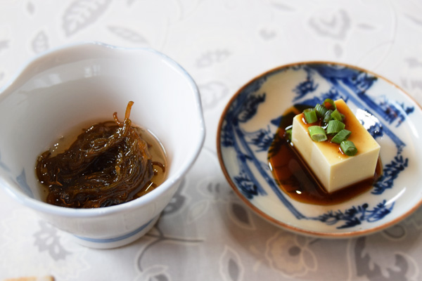 <写真左 もずく酢 写真右 やっこ 合わせたお酒:辛口吟醸 雑賀>