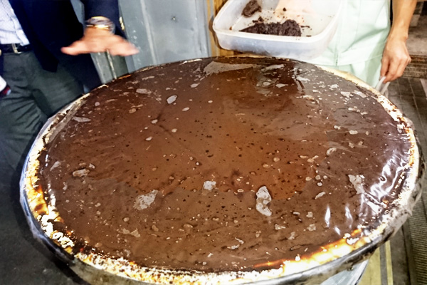 ▲食酢を発酵させている木桶。発酵が盛んな時期は表面を酢酸菌の膜が覆っています。発酵が落ち着くと膜は下方に沈むそう。