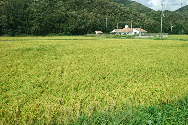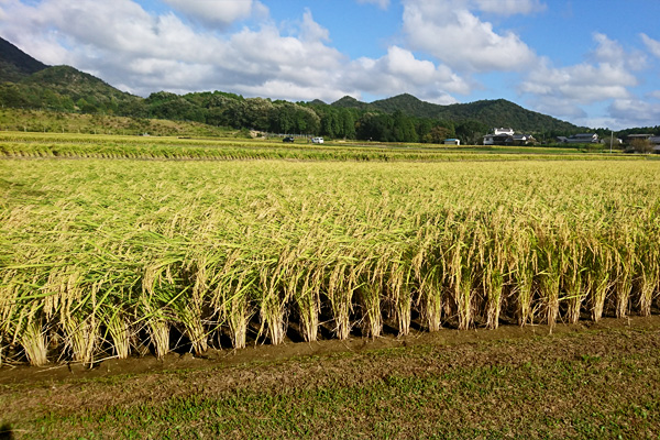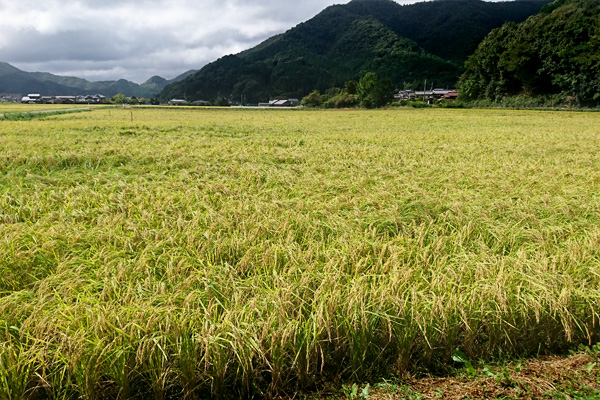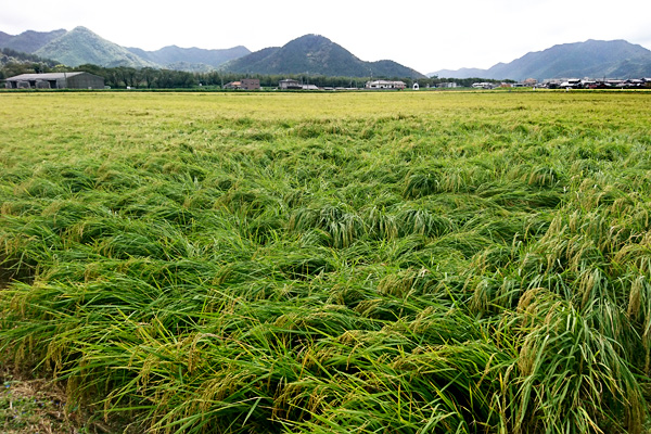 ▲門柳地区の稲は今夏、日照りで十分な水分が与えられなかった時期が続き、その後一気に雨が降った為倒れている稲が見受けられました。10/6時点で5割程度は緑の状態。