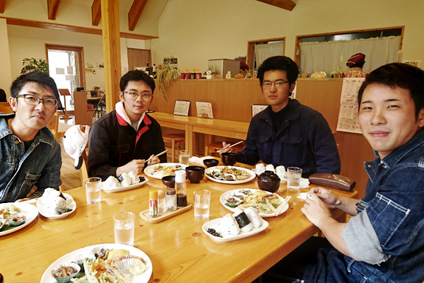 ▲左から金子さん、竹山さん、西村さん、竹内さん。田んぼと同じ黒田庄にある「農家レストラン日時計」で頂く九平治定食。食べごたえ抜群で、体の中から綺麗になるような味わいでした。