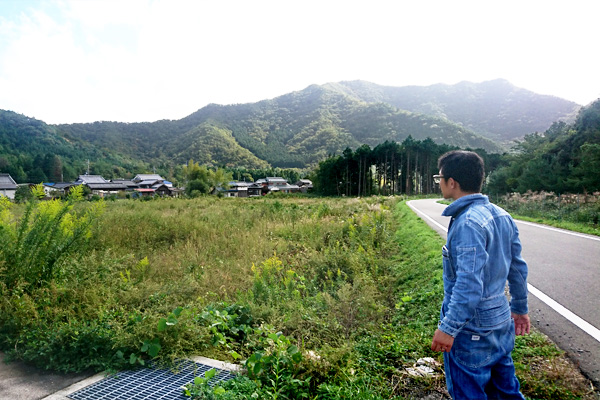 ▲この右手に新蔵が建設されます。奥に移る杉林の後方には黒田庄で育てた酒米を精米する精米場をつくります。左手には萬乗醸造の自社田が広がっています。
