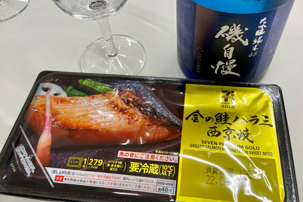 ―― セブンの代名詞金のシリーズから合わせてみましょうか。…金の鮭ハラミ西京焼と「磯自慢」は、鮭の味が引き立った後に磯自慢の上品な香りが立ってきますよ。どちらの風味も引き立って美味しいです!(松丸)