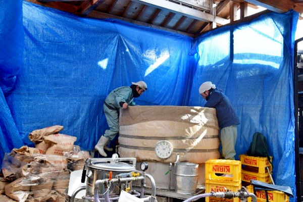 訪問させていただいた時、洗米、浸漬、蒸し作業を行っていました。以前、年季物の自動洗米機を使用していましたが、正確な吸水率が図れず、浸漬にムラができるので、今年からウッドソンを使用しています。甑は5年前、壺阪専務が杜氏になった時に購入した物。写真の通りブルーシートで仕切って作業スペースを確保しています。一度に800K、1時間蒸しで45分からスーパーヒーター(乾燥蒸気)を当てています。