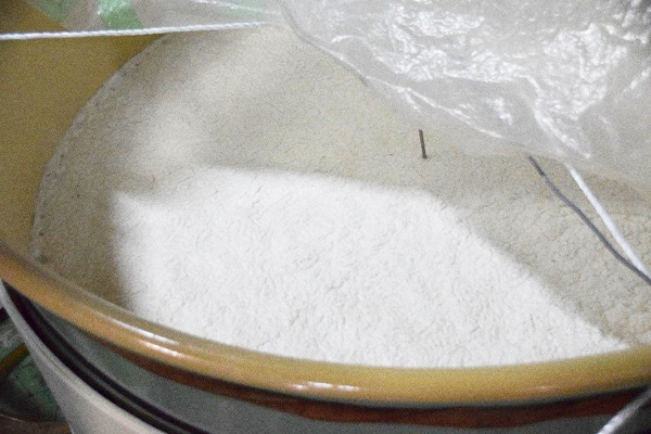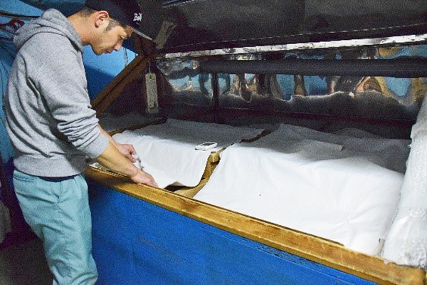 麹室は異なる温度と湿度に設定した複数の部屋に分ける蔵も多いですが、山陽盃酒造では一つの部屋のみ。蓋付きの箱を設置し、その中で異なる環境を作り出しています。部屋全体で種付けをする時の環境、蓋で密閉して湿度をあげる環境、温風を入れる事によって乾燥させる環境まで対応しています。前の杜氏さんの時から使用していますが、ここを使うのも今期か来期までとのことです。今まで麹室の真下に仕込み蔵があり、導線が活きていましたが、今回の火事の影響で移動させた甑と仕込み蔵から離れ、麹室だけが孤立した形になってしまったからです。