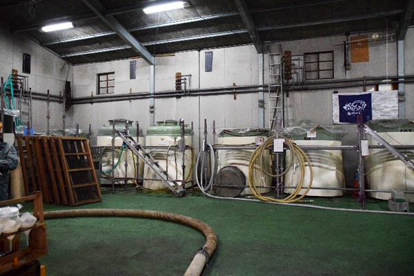 以前から物置のような状態で使っていなかった倉庫を現在仕込蔵として活用しています。かつて桶売りしていた時代に使用していた11,000L  や7,000Lといった大きなタンクが24本ありましたが、全て外に出して、小仕込み用のタンクに入れ替えました。工事現場などで使う足場を仮で組んで使用しています。この部屋全体に冷蔵設備が完備されており、ゆくゆくはリフォームしてきちんと仕込み蔵にする事も検討しています。