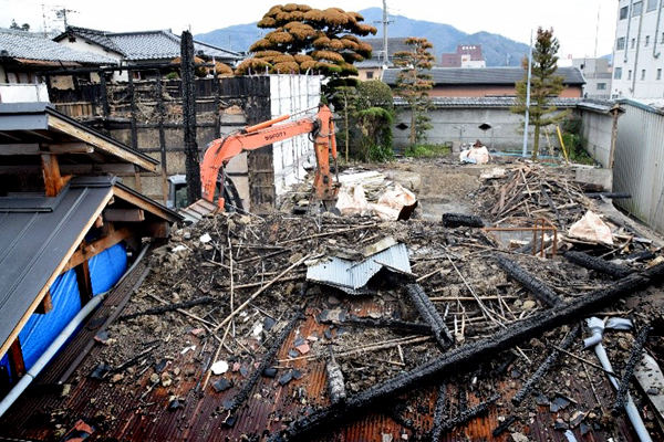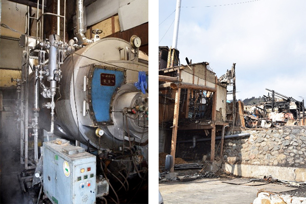 当時、ボイラーとつながったレンガ煙突の一部が崩れており、そこから漏れた排ガスが煙突脇の柱に直接吹き付けていました。排ガスはCO2なので、それ自体には引火性はありませんが、170℃近くの熱を持っているため、柱が徐々に炭化して燻り、出火したとの事です。ボイラー自体に引火しなかったのが唯一の救いでした。もし、そうなっていたら被害はさらに拡大していたかもしれません。燃え上がった炎はボイラー室のとなりの母屋にも燃え移り、二階は全焼し一階もほぼ全損となりました。明治~大正時代の建物で、建物自体が乾燥しており、火の回りが早くなった原因の一つでした。