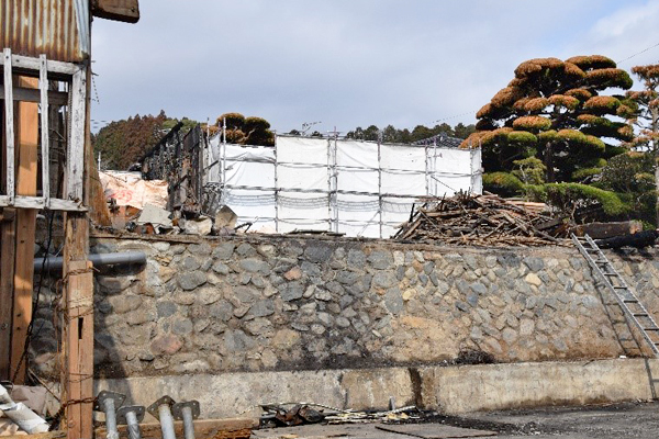 蔵の裏手の松の木は半分燃えてしまいましたが、この木と土壁が火を防いだことで、近隣へ火が燃え移らず済んだとの事。母屋にあった大黒柱も燃えましたが、現在、建築屋さんに預かってもらっており、ゆくゆくはそれをそのまま見える所に使って、戒めの為に後世に残していきたいと考えているそうです。