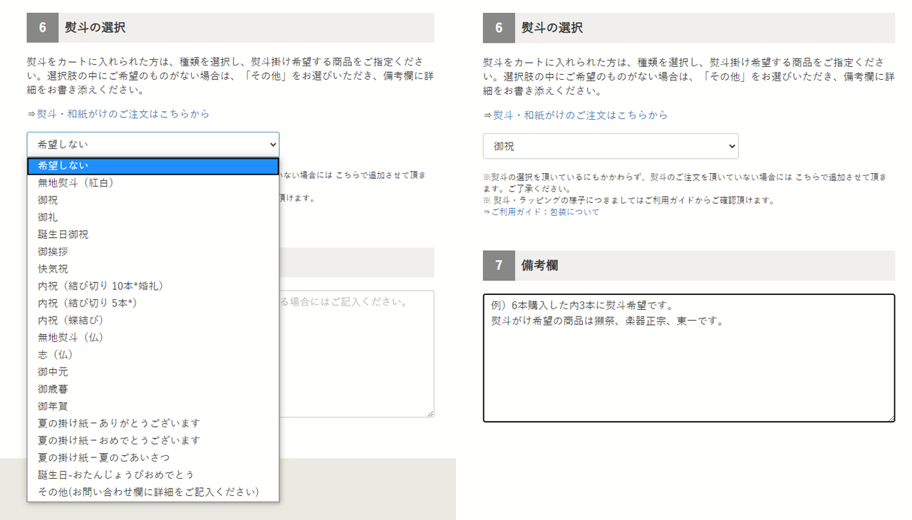 熨斗をご希望のお客様は、「和紙がけ・包装・熨斗がけ」・「有料ギフト箱」をカートに入れて頂いた後、ご注文ページの【6】熨斗の選択欄よりご希望の熨斗をご指定下さい。複数本ご購入の際は、どの商品に熨斗をお付けするか備考欄に必ずご記入ください。ご記入が無い場合は、ご購入頂いたラッピングの枚数に応じて弊社にて判断をさせて頂きます。ただし弊社での判断が難しい場合、一旦出荷作業を停止後にお客様へご連絡をさせて頂きます。その場合、着日指定等のご希望にそえないこともありますので、くれぐれも備考欄へのご記入をお忘れなくお願い致します。