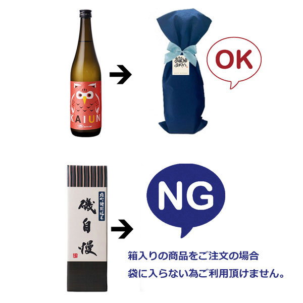 商品を紺色の不織布の袋にお入れし、リボンと「感謝」のメッセージタグをお付けいたします。こちらのラッピングをご利用いただける商品は下記の通りです。