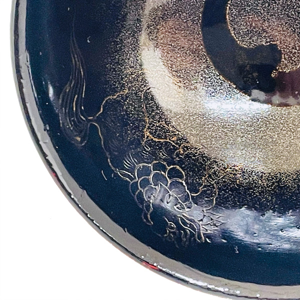 高台部が丈高になっている馬上盃(馬上杯)は馬上で飲酒するのに適した形であるため、また、器の腰が高く馬上にいるようであることから、この名がつけられました。盃の内側には2頭の獅子が描かれています。