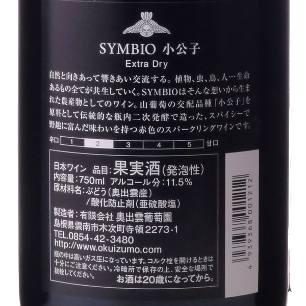 瓶内二次発酵による赤のスパークリングワイン。山ブドウ交配品種、小公子の特徴を活かした酸味やコク、弾ける泡と共にお楽しみください。ブドウの原産地は中央アジア・カラコルム地方。自生する山ブドウを親として交配された品種です。非常に濃い赤紫色の野趣溢れる赤ワインです。奥出雲葡萄園ではこの特徴的なブドウのワイン造りに注力し、長年にわたり試行錯誤を重ねています。注意事項