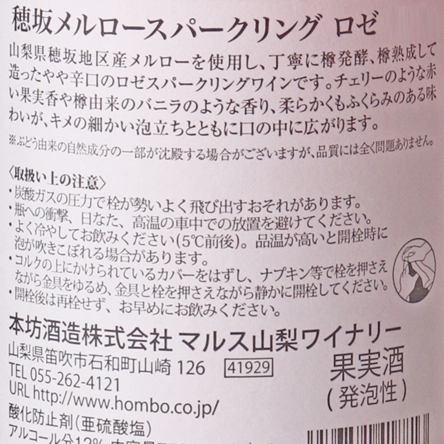 穂坂地区産の契約栽培メルロー種を使用し、そのおいしい果汁だけをフレンチオークでじっくりと樽醗酵し、さらにそのままフレンチオーク内でシュールリーして仕上げた、やや辛口のロゼスパークリングワインです。赤い花を連想させるフローラルな香りとチェリーなどの赤い果実を連想させる果実香、樽醗酵によるバニラ香などが複雑に絡み合い、きめの細かい泡立ちとともに、柔らかくもふくらみある味わいが広がる、美しいワインです。和洋中全般と相性が良く、トマトソースのパスタ、鶏の唐揚げ、野菜炒めなど、幅広く楽しめるワインです。注意事項