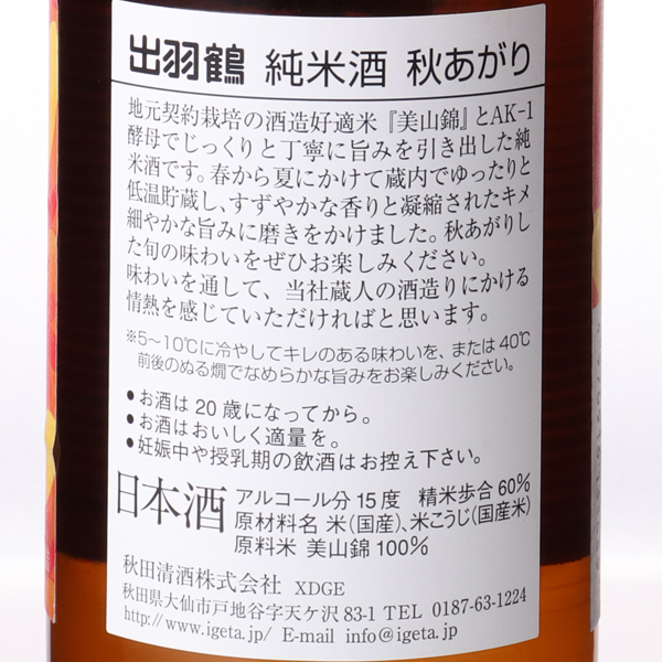 淡麗な味を生み出す美山錦と、酒の爽やかさを引き出す秋田流花酵母(別名AK-1)で仕込んだ数量限定の純米酒です。春から夏にかけてじっくり低温貯蔵することで、爽やかな香りと凝縮された旨みに磨きがかかりました。5〜10℃に冷やしてキレのある味わいを、または40℃前後のぬる燗でなめらかな旨みをお楽しみください。蔵紹介