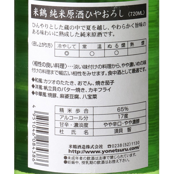 出羽きらり、出羽の里を使用。原酒のぎゅっと詰まったボディをお楽しみいただけます。熟成した冷卸らしい、落ち着いた口当たりと米鶴純米酒の特徴がよくわかる、爽やかでキレのある味わいが好バランス。蔵紹介
