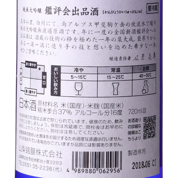 手間と時間を惜しまない、情熱をもった酒造り寛政3年、1750年創業。山梨県の北西部、山梨県北杜市白州町に蔵はあります。地元白州の水を大切にし、2014年に酒質設計を見直す際には真っ先に白州の水を体現できるお酒にすることを意識しました。さらに近年では、日本酒でしか表現できない発泡を目指し、数ある蔵の中でも「スパークリング日本酒」の製造に力を入れています。みずみずしくフレッシュさを閉じ込めたお酒を是非お試しください。