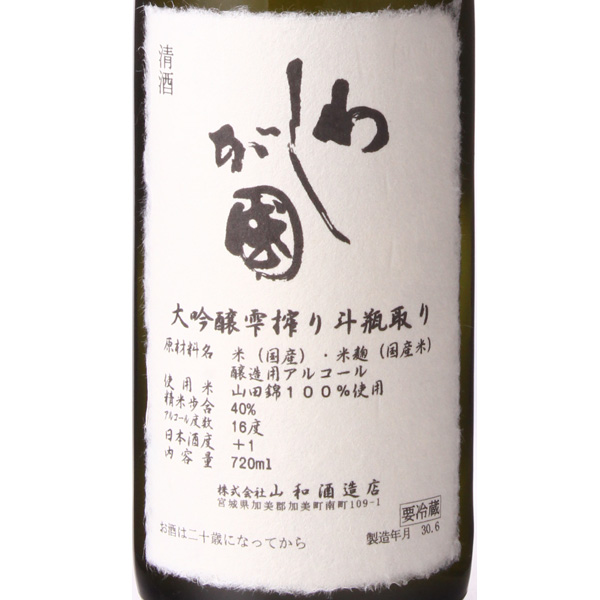 いい意味で期待を裏切るお酒明治29年、1896年創業。山形県に隣接する宮城県加美郡加美町に蔵はあります。蔵のある一帯は穀物地帯であり、豊富な米を収穫することができ、宮城を代表する米「ササニシキ」発祥の地である大崎平野が東に広がっています。蔵の代表銘柄「山和」は、2004年に誕生しました。米洗いから搾りまでをなるべく人の手で行い、丁寧な仕込みをされた純米酒だけのシリーズとなっています。目指す酒質は1杯目よりも2杯目3杯目に美味しいと感じられるお酒。流行に乗るのではなく、これが本当においしいお酒だと感じさせてくれるお酒です。
