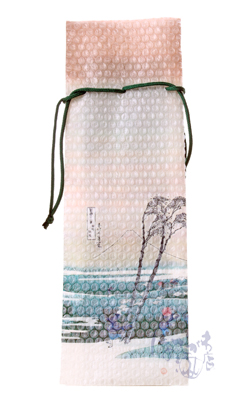 2018年度グッドデザイン賞を受賞。緩衝材の機能を併せ持つラッピング袋「浮世絵プチプチ」かつて陶器の輸出の際に緩衝材として用いられていた浮世絵が、西洋の人々を驚かせた事に着想を得て生まれました。四合瓶用、一升瓶用の2サイズのご用意です。日本酒はもちろんワインや焼酎などにもご利用いただけ、特別なギフトラッピングとしておすすめです。「葛飾北斎の富嶽三十六景 駿州江尻」が描かれています。