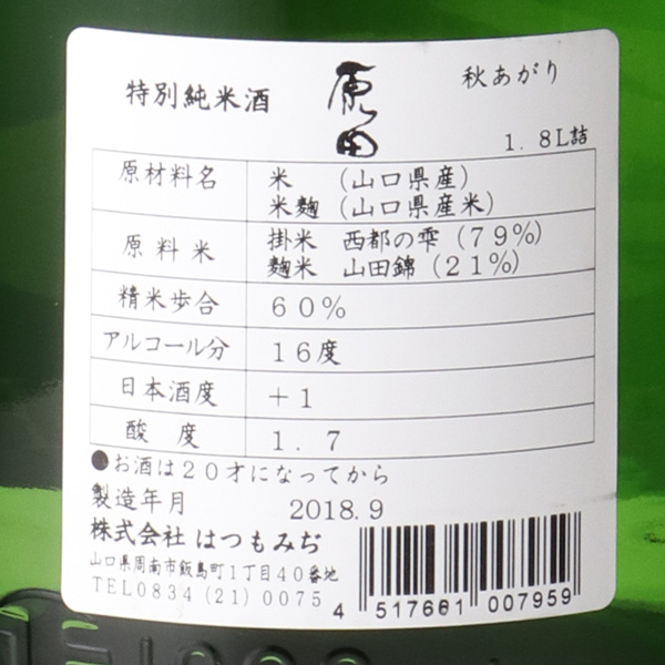 人々に健康と心の安らぎを提供「酒は文化の華」とも言われ、地酒はその地域の華でありたい。「はつもみぢ」は周南の華・郷土の美酒を合い言葉に、地域の米や水を生かし、周南の風土を品質やラベルに取り入れて行くように努めています。周南地方は瀬戸内海の静かな海に面し、北は島根県に接し、海の幸・山の幸は地酒の味を一段と引き立ててくれます。この幸せを皆様にお届けすることを使命として酒を醸します。