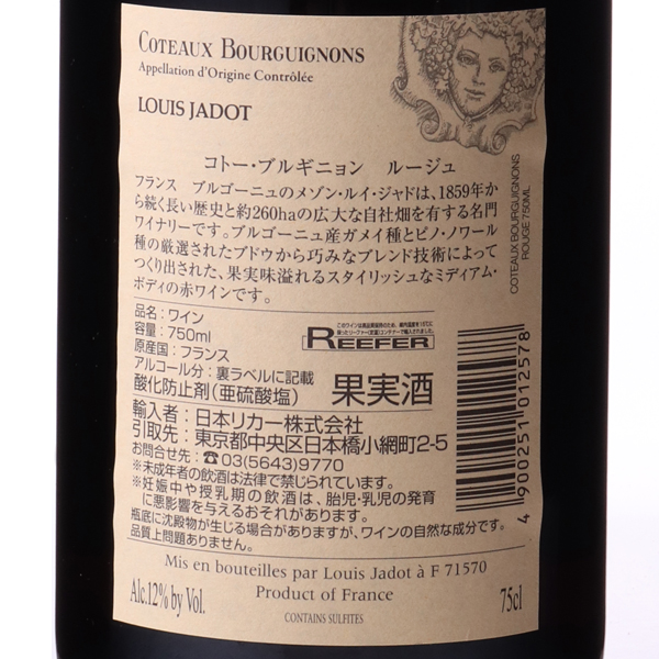 また、所有する自社畑のほとんどがグラン・クリュとプルミエ・クリュで占められていますが、ルイ・ジャドのラベルで販売されるワインは、すべて縁取りが施されたバッカスの顔と、淡いイエローという、同じデザインのラベルが用いられています。これは、ルイ・ジャド社が創設当初から、グラン・クリュからシンプルなA.O.C.ブルゴーニュに至るまで、すべてのアぺラシオンに対して同等の価値を置き、同等の熱意を持ってワイン造りを行っていることを示しています。