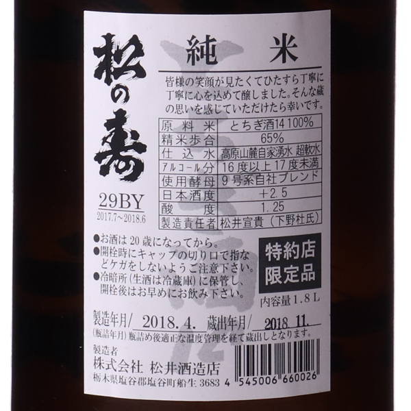 日常に寄り添い、思い出を共有できるお酒でありたい1865年、慶応元年創業。近年の杜氏の高齢化、及び人口減少を見越し蔵元自らが酒造りの修行を積み、平成18年に初代下野杜氏として認定されました。蔵元杜氏として、社長である松井宣貴氏が日々丹精込めて酒を仕込んでいます。裏山から湧き出る超軟水の湧き水で一滴一滴愛情込めて仕込んだお酒は、優しく上品で繊細な味わいに仕上がります。日本では最上級を意味する「松」と「寿」二つのおめでたい言葉が重なる銘柄「松の寿」。是非ハレの日にお選び頂きたい日本酒です。