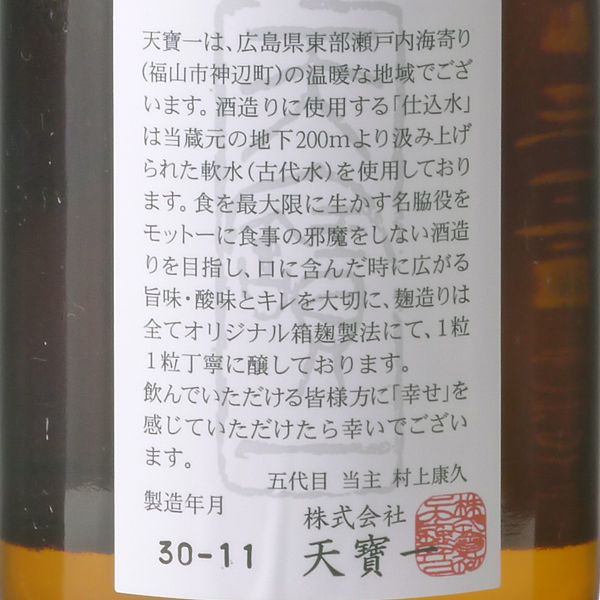 瀬戸内の恵みと和食に合う、究極の日本酒1910年に創業。福山を玄関口に、10kmほど北上した場所に位置する、“神の辺り”「神辺」の地で100年以上続く天寶一は、今では福山市唯一の酒蔵です。酒蔵が常に大切にしているのは、食事との調和です。超軟水である古代水と丁寧な絞りが生み出す「柔らかな酸」が、フレッシュなキレの中に、心地よい余韻を運んできます。瀬戸内の小魚などとも相性が良く、料理を引き立てるうえでは、欠かせない食中酒です。