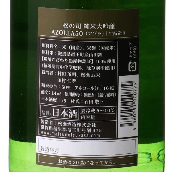 松の司の酒米への取り組みを象徴するひとつがこのAZOLLAシリーズです。AZOLLAを通じて表現したい思いは「自然」。原料米は栽培期間中無農薬・無化学肥料で栽培された地元竜王町産の山田錦を使用しています。無農薬・無化学肥料と書けばたった10文字足らずですが、契約栽培農家の方々の大変な手間と努力の上に成り立っています。自然ならではの強い生命力や勢いのある躍動感。それらを力強く且つ優しくまとめ上げてくれる力として、培養酵母に頼らない生もと造りで醸しました。受賞歴