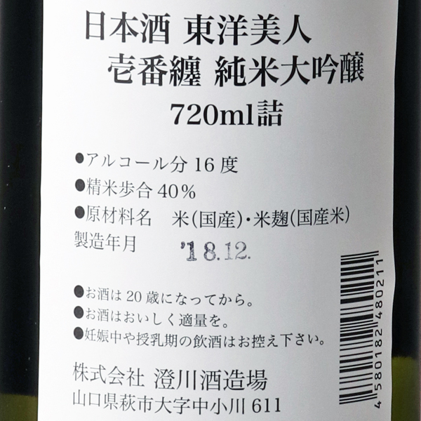 令和5酒造年度山口県新酒鑑評会で、『大吟醸酒』 『純米吟醸酒』 『純米酒』3部門の最優等賞を、すべて「東洋美人」が受賞しました。東洋美人の最高峰です。商品名はいちばんまといと読み、一番の晴れ着という思いを込めて名付けられました。旨み・香り・キレ・きれいな酸が絶妙にして最上のバランスを保っています。限りない透明感とどこまでも続く深い余韻は、ぜひ試して欲しい逸品です。