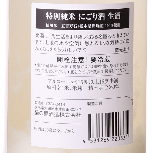 栃木県産那須五百万石で醸した純米酒。シュッと爽やかな発泡性の刺激、凝縮された濃密な旨み、個性溢れる冬ならではの味わい。辛い料理との相性もいいです。注意事項