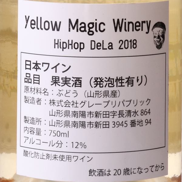 山形県南陽市竹田氏栽培デラウエア100%使用。竹田氏の圃場は「100年圃場」であり、代々受継がれている素晴らしい圃場です。綺麗に管理されデラウエアも色付き完璧な状態でした。糖度も23度以上ながら酸度も申し分なく。今回は「ホ ールパンチ」という搾り方。これは房のまま搾汁機に投入し優しく搾る方法だ。果梗が壊れず雑味が少ない荷重が得られるのである。自然発酵し発酵終了後瓶内二次発酵させた。もともとアルコール12%という飲み応えに、ハジける泡感により、しっかりとした「微発泡ワイン」が楽しめるでしょう。音楽の「HipHop」の ように自然に「お尻浮き」が感じられるのが「HipHop」シリーズです。ぼくが長年作り続けてきた「デラウエア微発泡辛口ワイン」は ここ「Yellow Magic Winery」にて更に進化させていきたいと思っていますので宜しくお願いします。ワイナリー資料より