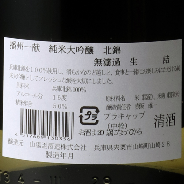 手間・ひまを惜しまず山陽盃酒造は天保8年、1837年創業。揖保川のほとり、旧城下町である兵庫県宍粟市山崎町に、中国山脈の奥深くより流れ出る清流に抱かれ、大自然の恩恵を受け酒を醸しています。江戸時代から使われている仕込み蔵で造られた酒は、瓶詰され明延鉱山の中にある、明壽蔵に運ばれます。ここは一年を通して、気温が9度前後に保たれる天然の冷蔵庫です。遮光性が高く、温度が一定の環境は日本酒をじっくりと熟成させるのに最適で、この蔵で熟成させた酒は驚くほどまろやかな味わいに仕上がります。播州一献には播州地域の良質の米・水・環境を使い地酒本来の持つ良さを大切に醸したお酒をどうぞ、との想いがこもっています。現在では杜氏の壺坂専務を中心に、兵庫三大錦のひとつ北錦で醸す等、味わい豊かな食中酒を醸し多くの日本酒ファンに親しまれています。