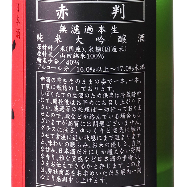 山田錦40%を使用した赤判純米大吟醸のおりがらみバージョン。華やかでふんわりした印象はそのままに、おりとからんだときの絶妙な旨味が楽しい1本です。注意事項