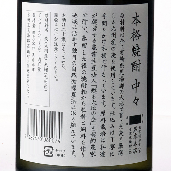 中々 麦焼酎 25度 / 黒木本店