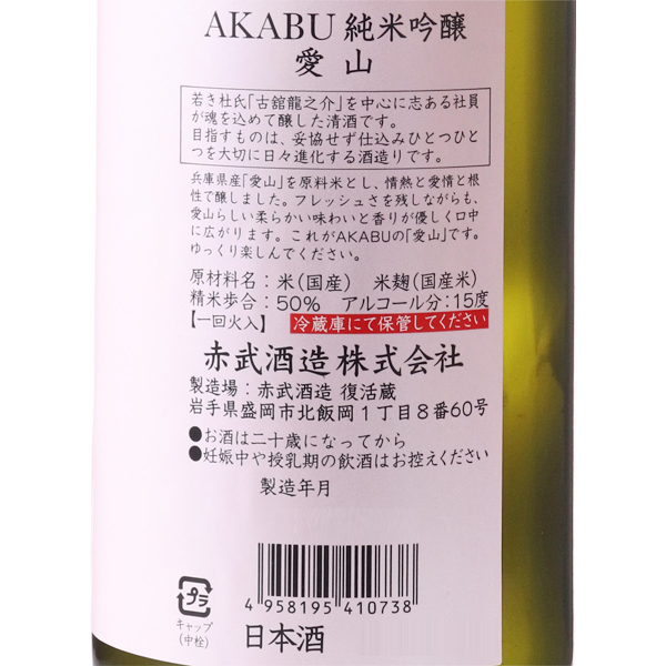 兵庫県産の愛山を原料に情熱と愛情と根性で醸しています。フレッシュさを残しながらも愛山らしい柔らかい味わいと、香りが優しく口の中に広がります。これがAKABUの「愛山」です。ゆっくり楽しんでください。受賞歴