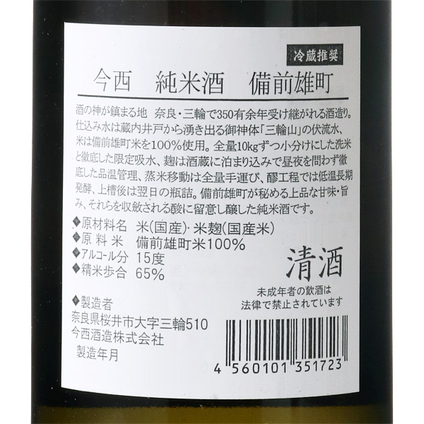みむろ杉を醸す蔵元、今西将之さんの名字を冠したお酒です。岡山県産の雄町を65%精米しました。穏やかな吟醸香に軽快な甘味と旨味の広がる口当たりから、瑞々しい酸と雄町らしい余韻へと続く心地よいキレのある味わいをお楽しみください。蔵紹介