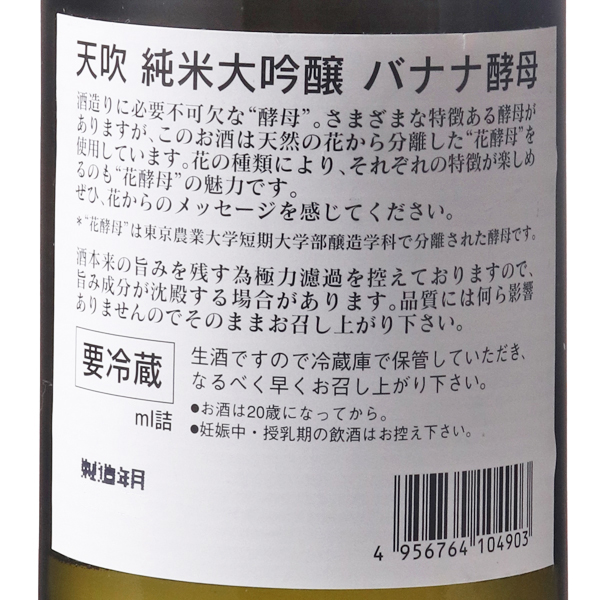 バナナ酵母を使用して醸しました。甘すぎず、後味もすっきりとした、全体のバランスが良くとれた純米大吟醸に仕上がっています。口に含むと心地よいバナナの香りが広がります。壽限無50%精米。蔵紹介