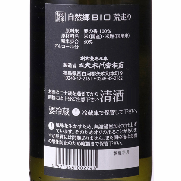 無農薬栽培米仕込みの先駆者が手がけるナチュラルな日本酒です。福島ならではの日本酒を造るため、米・水・酵母全てを福島県産にこだわった自然郷。「BIO(バイオ)」は原料米や麹など素材の味わいを生かすため、生もと系酵母で仕込み、無濾過無加圧で仕上げた一本です。夢の香を使用した、無濾過無加水一回火入れの純米酒。野趣(野性味)を追求し、一層ナチュラルな味わいとなっています。搾りにおいて、一番最初に出てくる部分を瓶詰め。力強くフレッシュな酸と果実の様な華やかな旨味の生もと系特別純米です。