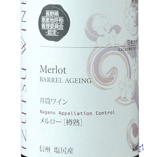 塩尻市の自社及び契約農園にて収穫のメルローを使用。フレンチオークの小樽で約18ヶ月間樽熟成させ瓶詰めした、ややしっかりとしたフルボディタイプ。オーク樽での熟成を経て、メルローの柔らかさに甘く香ばしい深み、厚みが感じられるワイン。NAC=長野県原産地呼称管理制度農産物やその加工品の原産地が長野県であることを保証する制度で、2002年から導入されました。ワインの場合、信州でとれた葡萄を使い、信州で醸造、瓶詰され、さらに厳しい官能審査(色・香り・味など)に合格したものだけが認定されます。蔵紹介